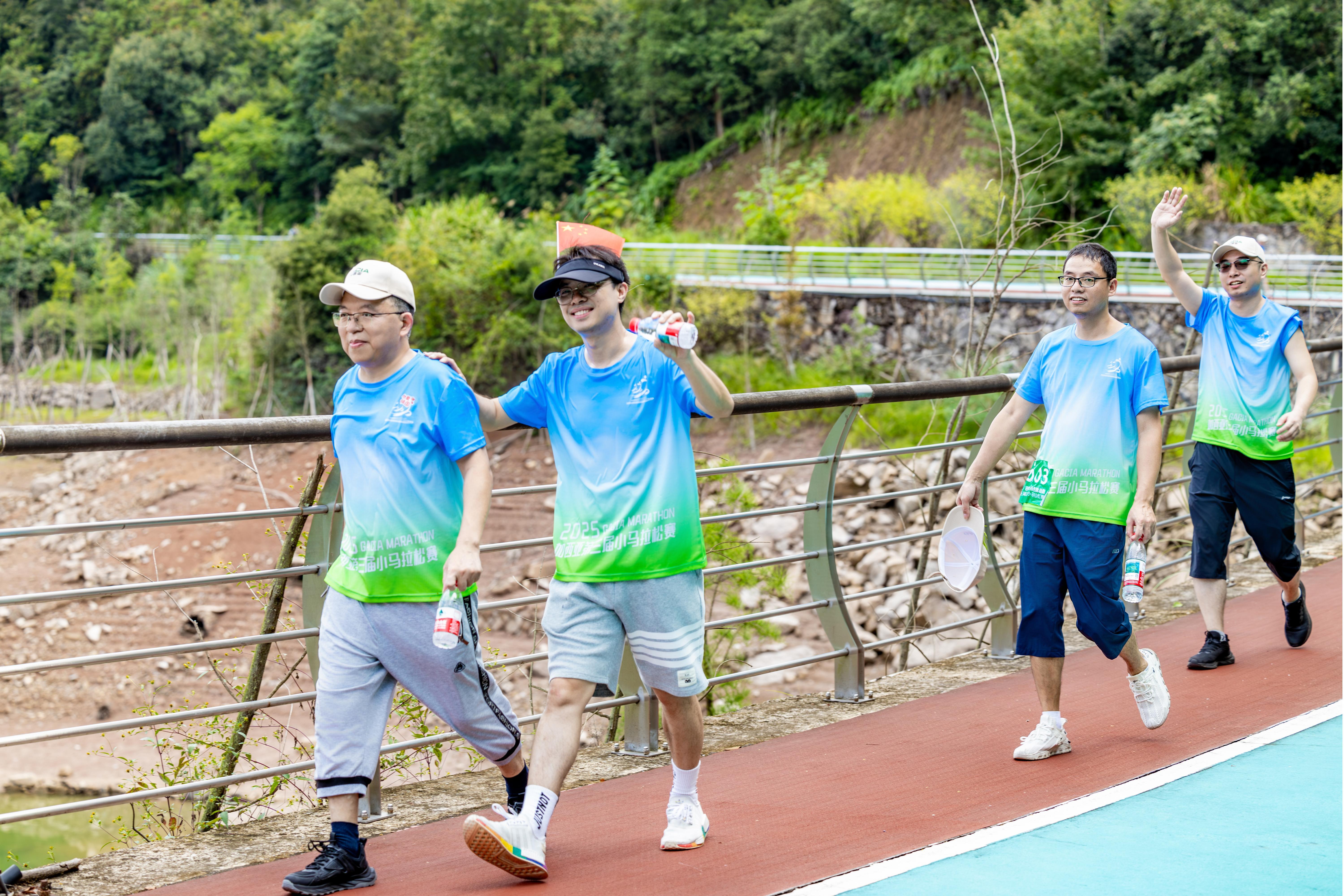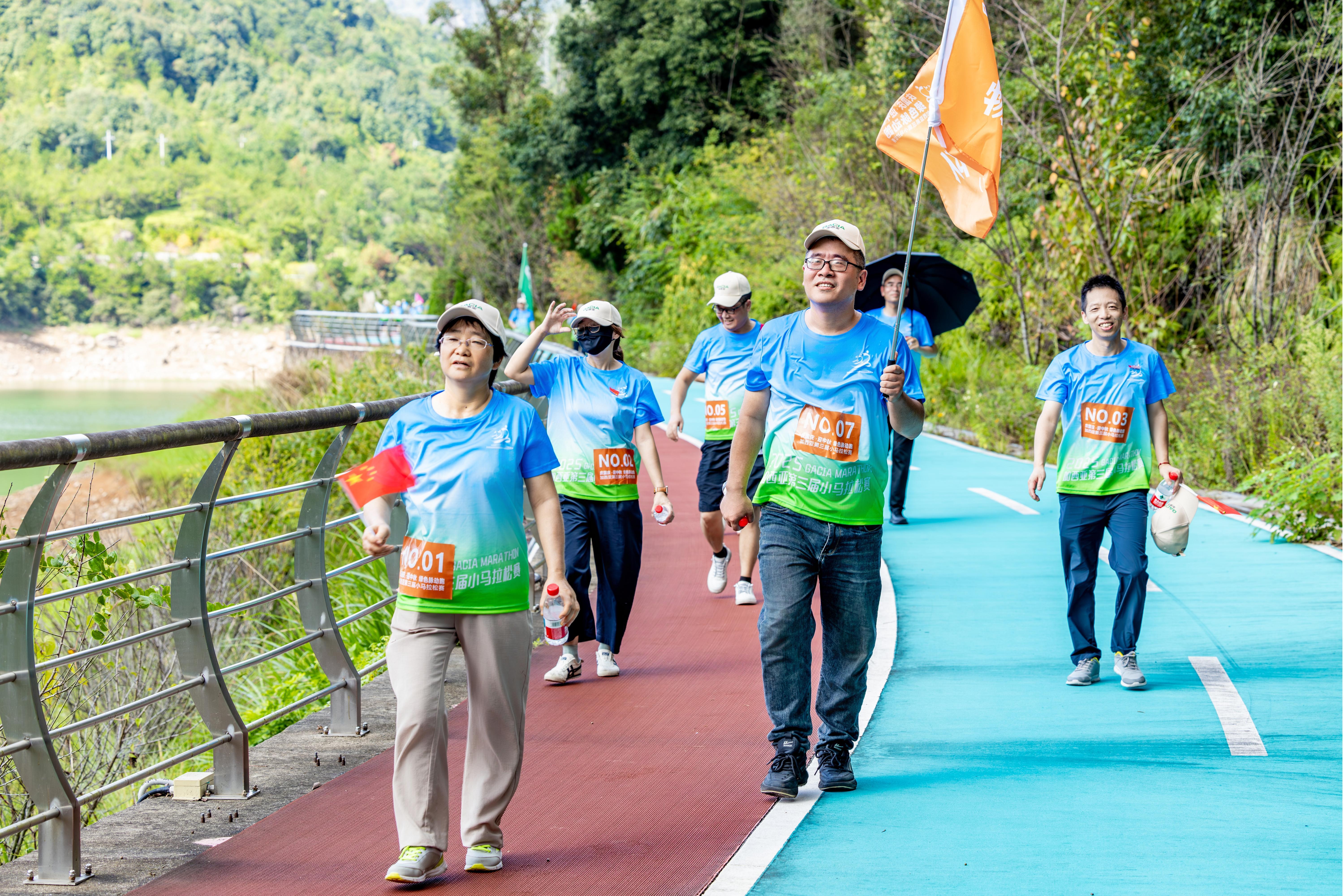 8时30分,活动正式拉开序幕。随着裁判员的口令,一支马拉松队与八支代表各中心的徒步队,在激昂口号的引领下,意气风发地踏上各自赛道。秋日晴好,钟前水库绿荫环绕,碧波粼粼,如一幅诗意画卷,平添无限生机。